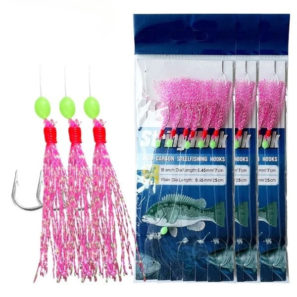 Consisting of a main line with 6 to 10 small hooks, each decorated with bait-mimicking feathers, iridescent film, or plastic lures, with a heavy weight at the bottom.