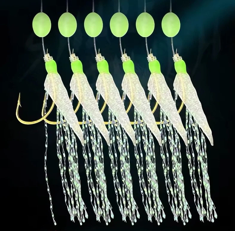 Usually features a series of 3 to 6 hooks decorated with vibrant, soft plastic bodies, reflective feathers, and luminous, glow-in-the-dark or glitter, attracting fish by mimicking injured baitfish.